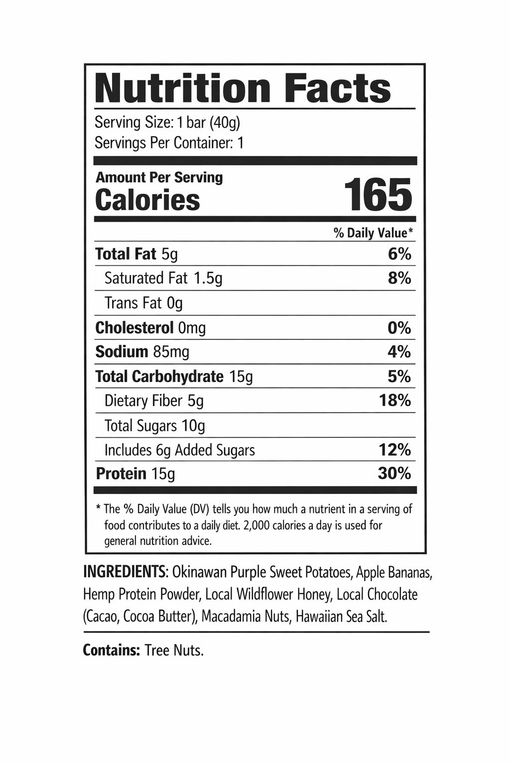 Okinawan Sweet Potatoes. Dark Chocolate. Apple bananas. Dried bananas. Wildflower Honey. Hemp protein, Macadamia nuts.